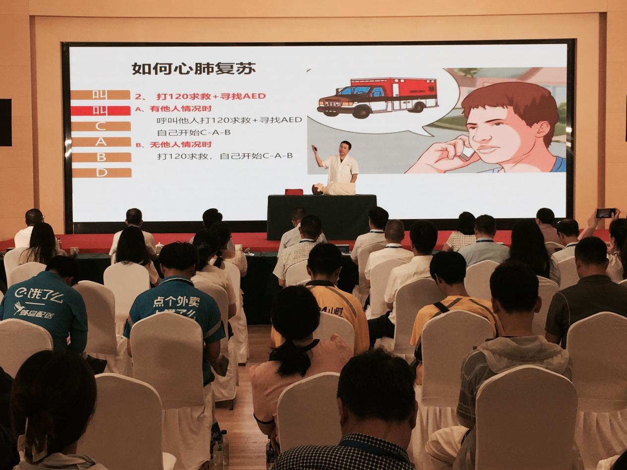 医务工作者为大家讲解防暑降温措施,并展示心肺复苏正确示范。
