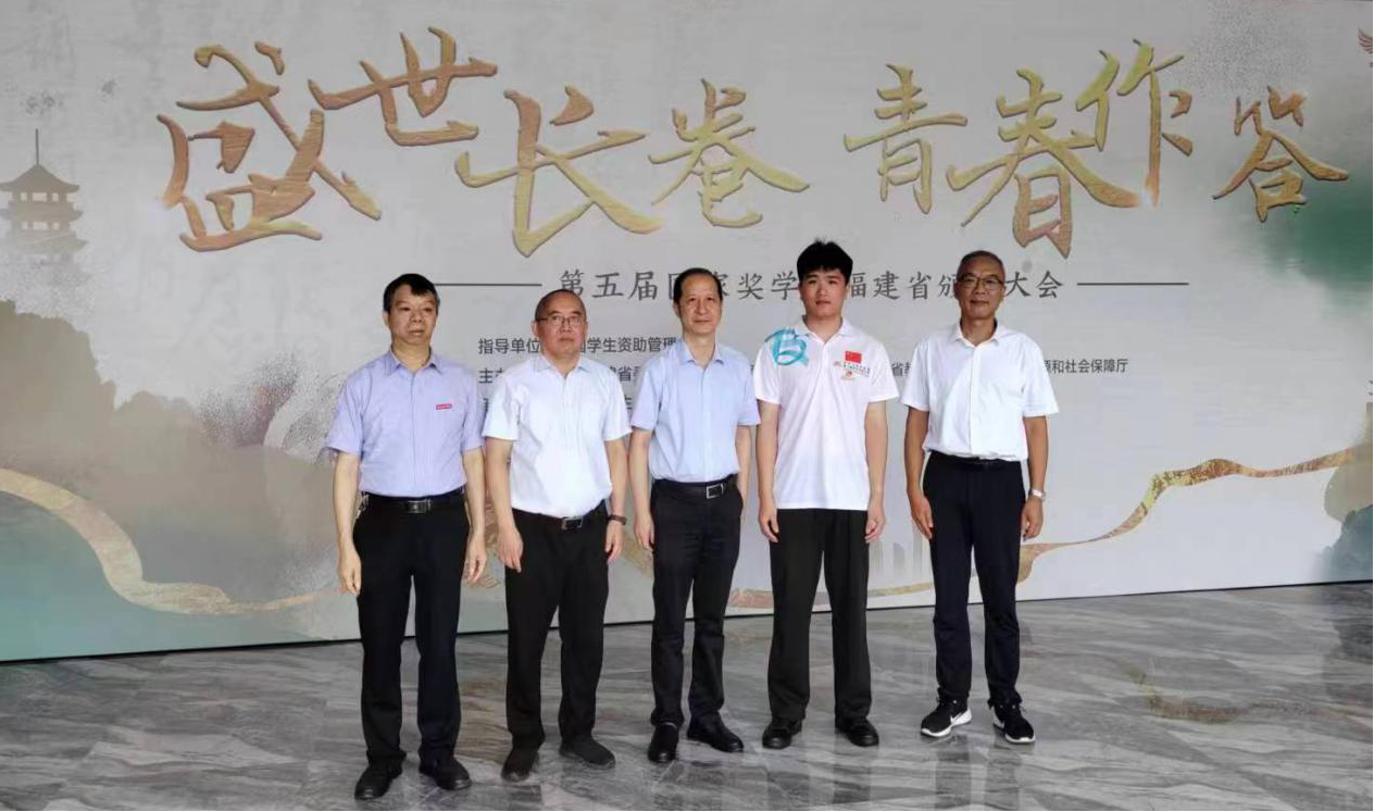省人社厅党组成员、副厅长郑朝晖等与获奖学生代表蒋潇湧合影