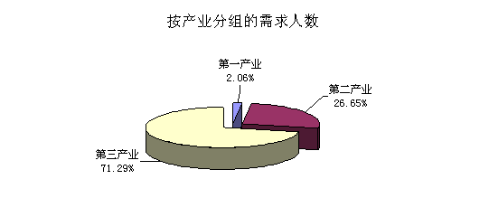 从产业需求来看:第三产业所需劳动力比重本季度为71.29%,比去年一季度增长12.85个百分点,第一产业、第二产业用工需求比例分别为2.06%、26.65%,第二产业劳动力需求量较去年同期的42.53%下降15.88个百分点。
