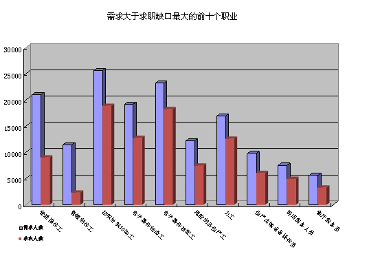 一是求大于供岗位(工种):普通操作工、鞋帽制作工、纺织针织印染工的市场登记缺口分别是11985人次、9122人次、6706人次。二是供大于求岗位(工种):办公人员、营业员、保管人员的市场登记缺口分别是-5571人次、-4995人次、-3352人次。
