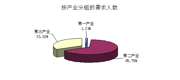 从产业需求来看:第二产业所需劳动力比重本季度为65.75%,比上年同期上升4.38个百分点,第一产业、第三产业用工需求比例分别为1.23%和33.02%,较上年同期分别下降0.75和3.61个百分点。