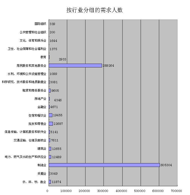 从行业需求来看:制造业、居民服务和其他服务业、批发和零售业占据着各行业中用工量的前三位。制造业占59.41%排在第一,居民服务和其他服务业占28.39%位居第二位,批发和零售业占2.23%排在第三。