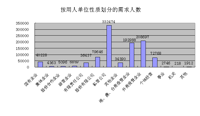 从用人单位性质来看:私营公司、外商投资企业、港澳台商投资企业为用工需求量前三位的用人单位,用工需求量分别占需求总量的32.63%、20.48%、18.94%,内资企业需求总量为53.95万人次,所占比重达到52.95%。