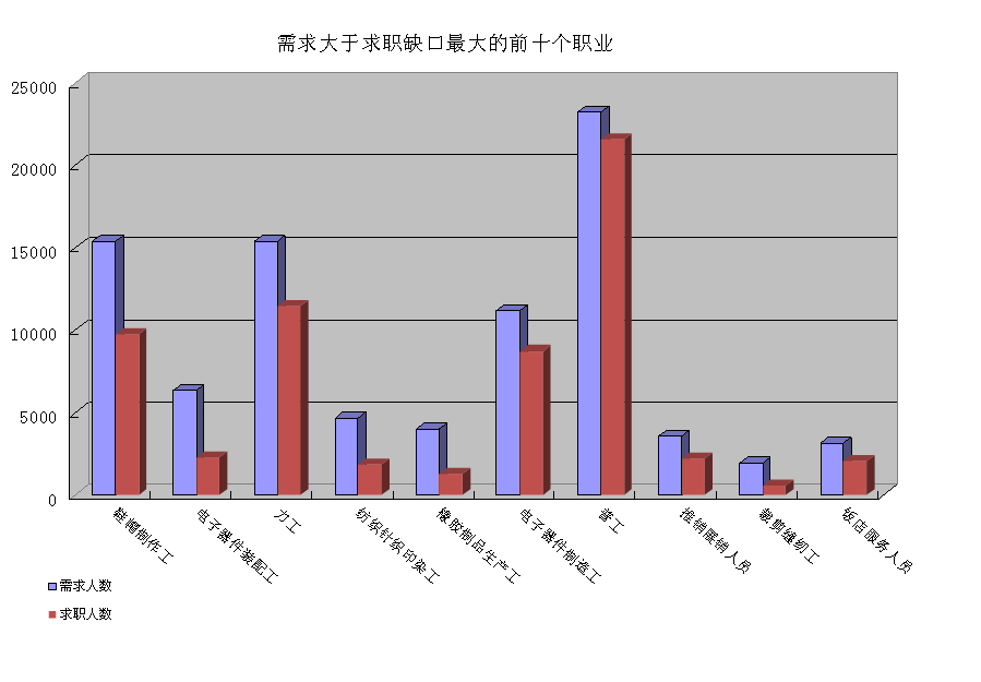 一是求大于供岗位(工种):鞋帽制作工、电子器件装配工、力工的市场登记缺口分别是5663人次、4053人次、3856人次。二是供大于求岗位(工种):秘书、营业员、保管人员的市场登记缺口分别是-2909人次、-2467人次、-2044人次。