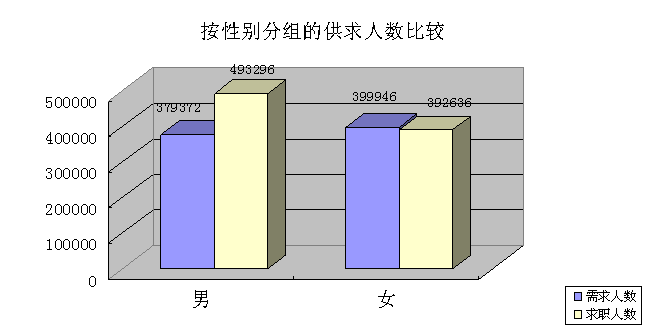 从性别上看,男、女求职人数各占总量的55.68%和44.32%,男性劳动力供给仍然高于女性,女性求职人数与上年同期基本持平。