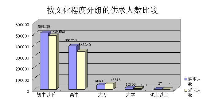从文化程度上看,高中和初中以下学历的求职人员占求职总数的93.45%。整个人力资源供给市场学历仍相对较低,人力资源供给的素质结构需要进一步提升。