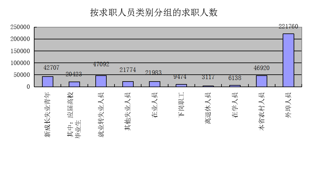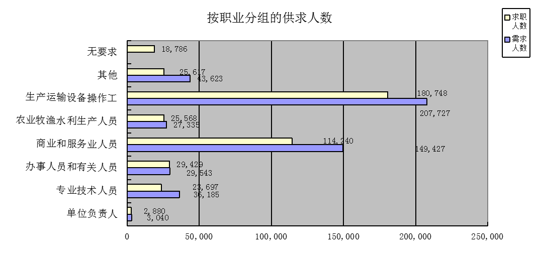 本季度职业供求总量为91.78万人次,同比上升49.77%,环比下降3.55%。其中:岗位需求登记49.68万人次,同比上升50.63%,环比下降8.02%;求职登记42.10万人次,同比上升32.78%,环比上升2.33%。
