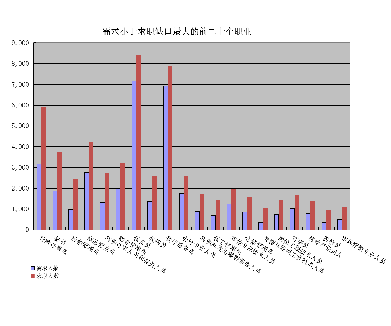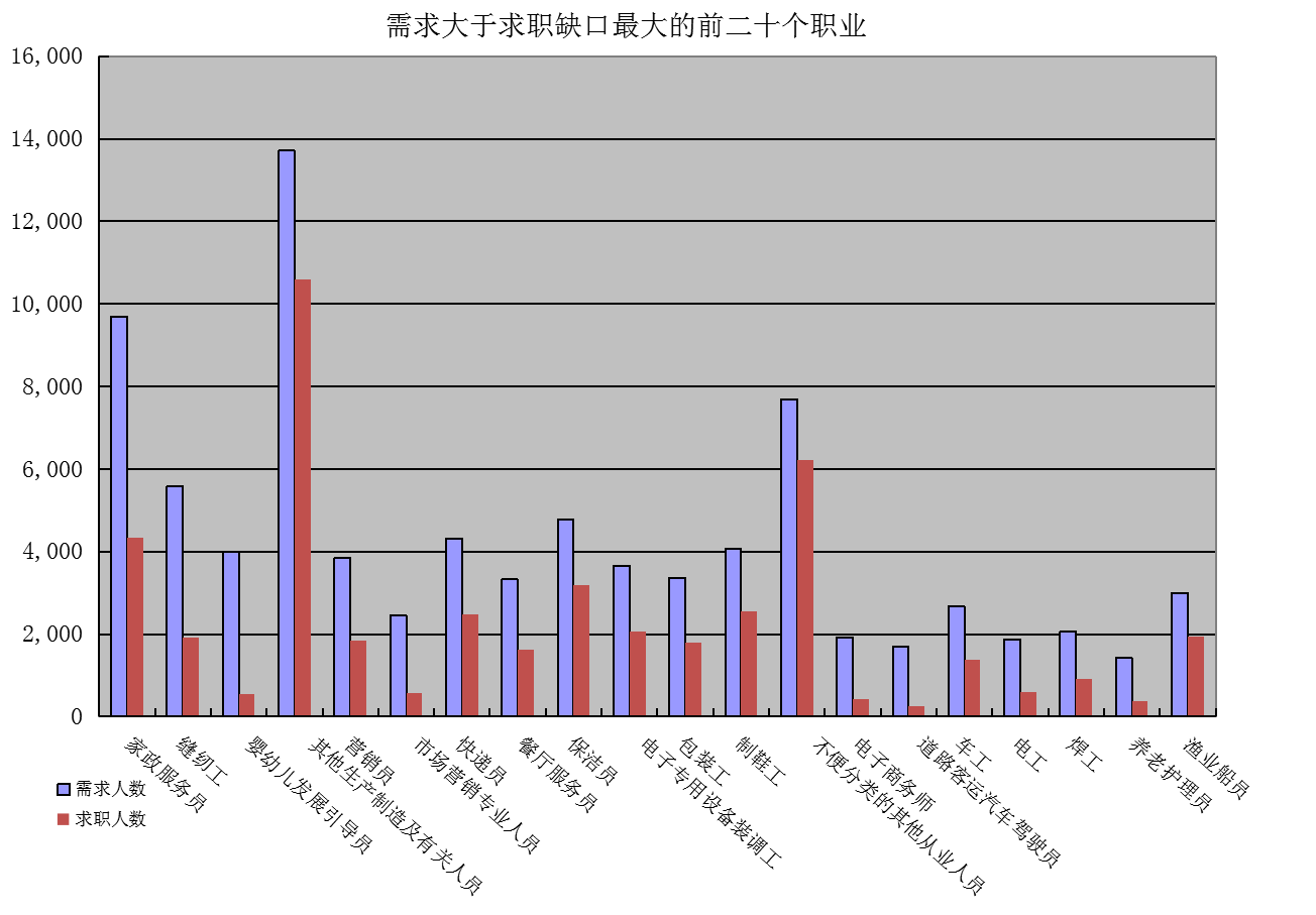 一是求大于供岗位(工种):家政服务员、缝纫工、婴幼儿发展引导员缺口分别是5370人次、3680人次、3443人次。二是供大于求岗位(工种):行政办事员、秘书、后勤管理员的市场登记缺口分别是-2733人次、-1915人次、-1487人次。