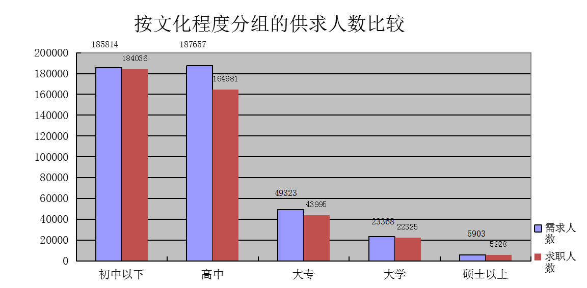 从文化程度上看,高中和初中以下学历的求职人员占求职总数的82.84%,整个人力资源供给市场学历仍相对较低,人力资源供给的素质结构需要进一步提升。