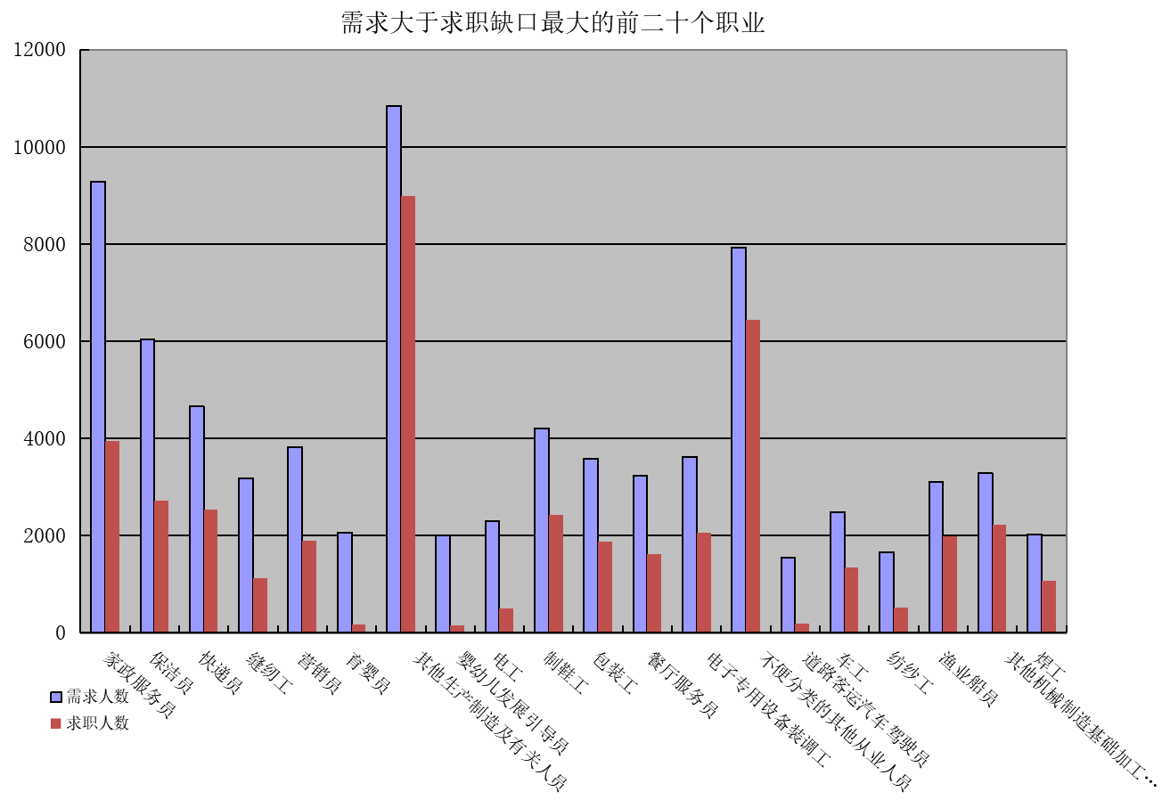 一是求大于供岗位(工种):家政服务员、保洁员、快递员缺口分别是5339人次、3313人次、2138人次。二是供大于求岗位(工种):行政办事员、秘书、保安员的市场登记缺口分别是-2937人次、-2102人次、-1771人次。