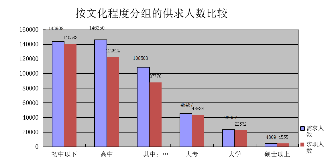 从文化程度上看,高中和初中以下学历的求职人员占求职总数的78.76%,整个人力资源供给市场学历仍相对较低,人力资源供给的素质结构需要进一步提升。