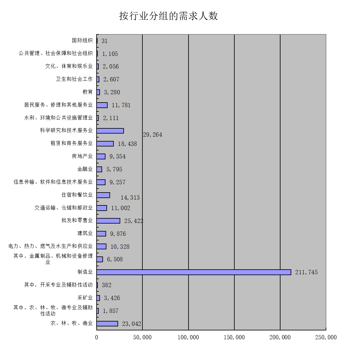 从行业需求来看:“制造业”、“科学研究和技术服务业”、“批发和零售业”占据着各行业中用工量的前三位。“制造业”占比52.38%排在第一位,“科学研究和技术服务业”占比7.24%位居第二位,“批发和零售业”占比6.29%排在第三位。