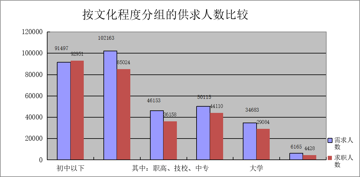 从文化程度上看,高中和初中以下学历的求职人员占求职总数的69.63%,整个人力资源供给市场学历仍相对较低,人力资源供给的素质结构需要进一步提升。