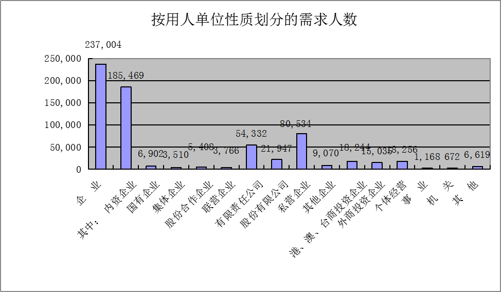 从用人单位性质来看:内资企业需求总量为18.55万人次,所占比重达到企业需求总量的78.25%;内资企业中的“私营公司”、“有限责任公司”、“股份有限公司”为用工需求量前三位的用人单位,用工需求量分别占企业需求总量的33.98%、22.92%、9.26%。