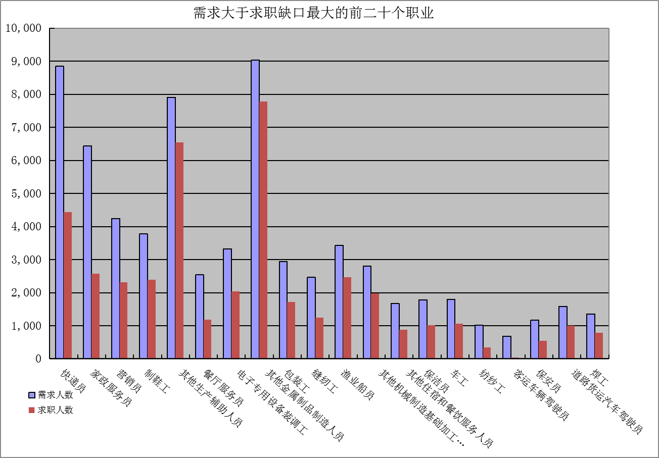 一是求大于供岗位(工种):“快递员”、“家政服务员”、“营销员”企业需求缺口分别是4409人次、3867人次、1927人次。二是供大于求岗位(工种):“行政办事员”、“仓储管理员”、“秘书”的市场登记缺口分别是-2164人次、-1803人次、-1673人次。