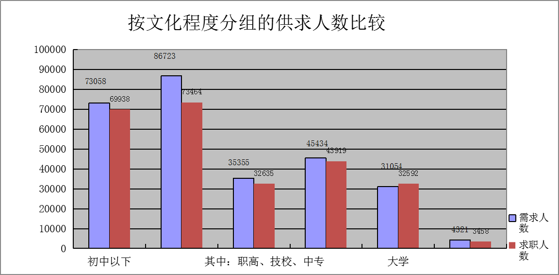 从文化程度上看,高中和初中以下学历的求职人员占求职总数的64.2%,整个人力资源供给市场学历仍相对较低,人力资源供给的素质结构需要进一步提升。