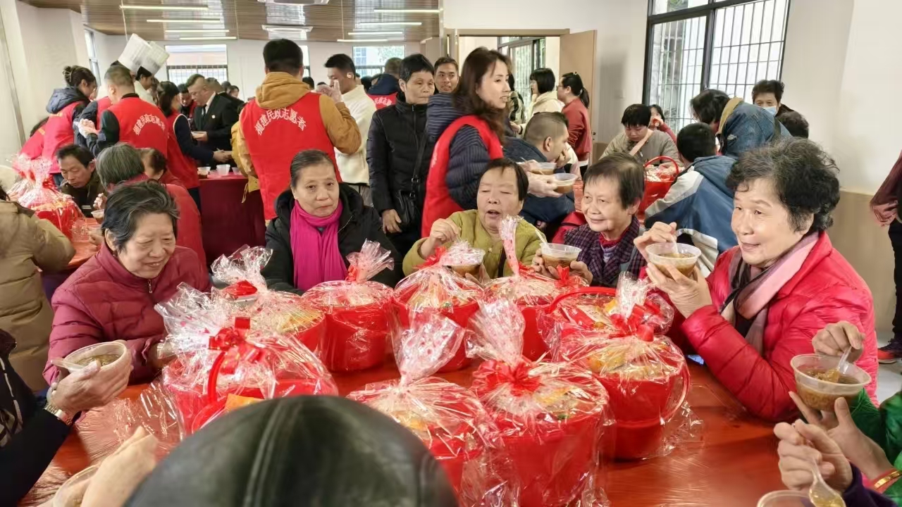在活动现场,志愿者们为群众和辖区百岁老人们送上了香甜暖心的“拗九粥”与寓意着吉祥与平安“太平面”礼包。文明实践站内,粥香四溢,情暖意浓,喜悦幸福的笑容洋溢在每个人的脸上。
