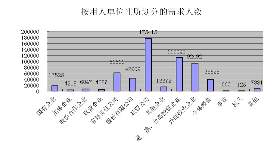 从用人单位性质来看:私营公司、港澳台商投资企业、外商投资企业为用工需求量前三位的用人单位,用工需求量分别占需求总量的30.41%、19.43%、16.03%,内资企业需求总量为32.55万人次,所占比重达到56.44%。