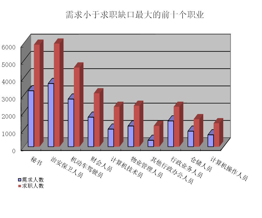 一是求大于供岗位(工种):纺织针织印染工、电子器件制造工、鞋帽制作工的市场登记缺口分别是4037人次、3353人次、3309人次。二是供大于求岗位(工种):秘书、治安保卫人员、机动车驾驶员的市场登记缺口分别是-2668人次、-2311人次、-1829人次。