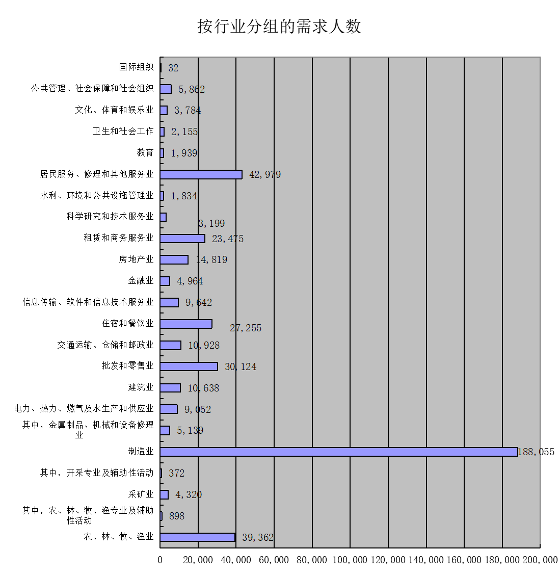 从行业需求来看:“制造业”、“居民服务、修理和其他服务业”、“农、林、牧、渔业”占据着各行业中用工量的前三位。“制造业”占比43.29%排在第一位,“居民服务、修理和其他服务业”占比9.89%位居第二位,“农、林、牧、渔业”占比9.06%排在第三位。