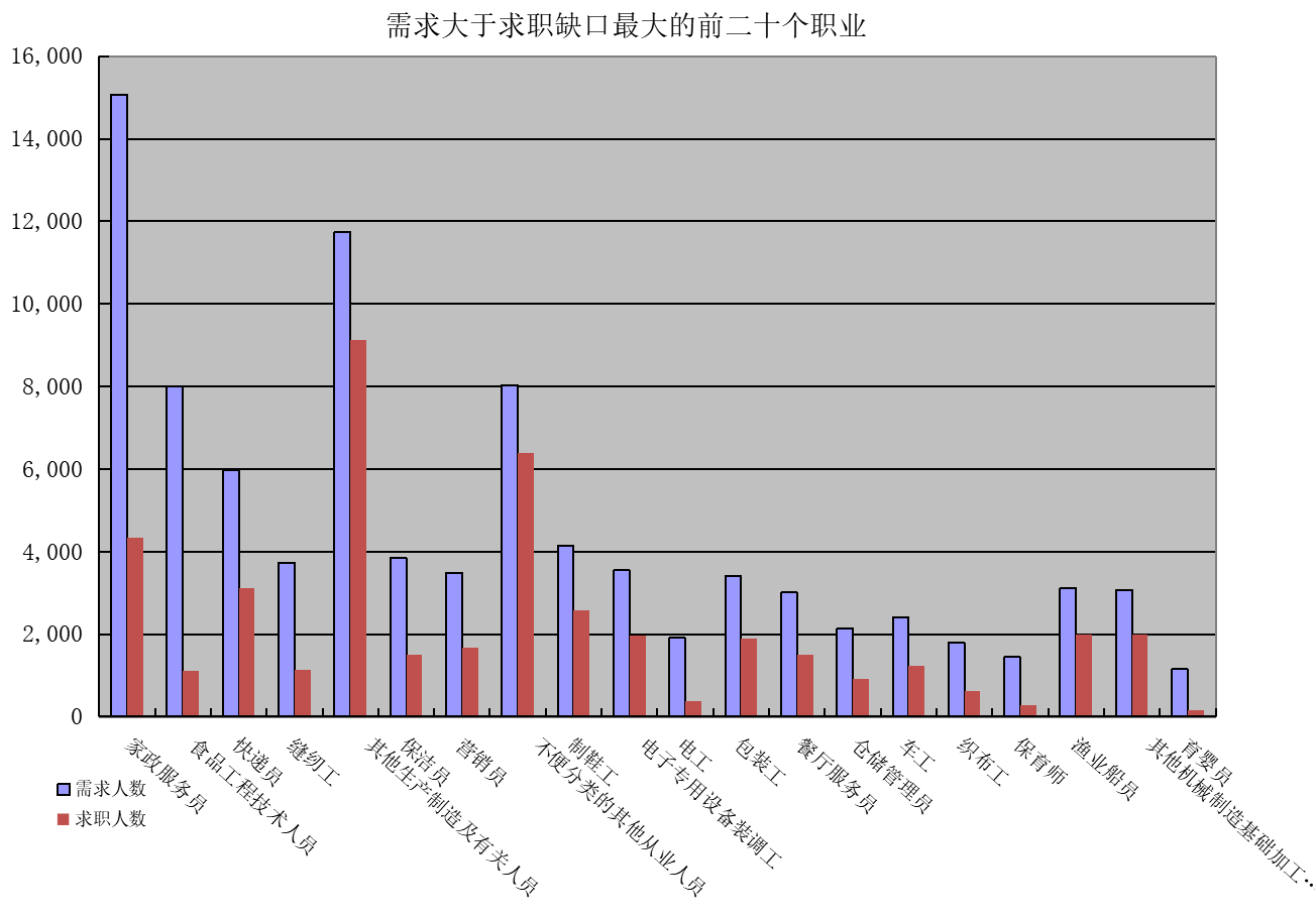 一是求大于供岗位(工种):家政服务员、食品工程技术人员、快递员缺口分别是10725人次、6905人次、2847人次。二是供大于求岗位(工种):行政办事员、秘书、其他办事人员和有关人员的市场登记缺口分别是-3223人次、-2081人次、-1778人次。