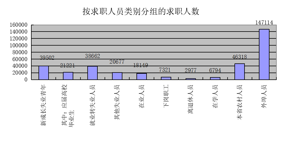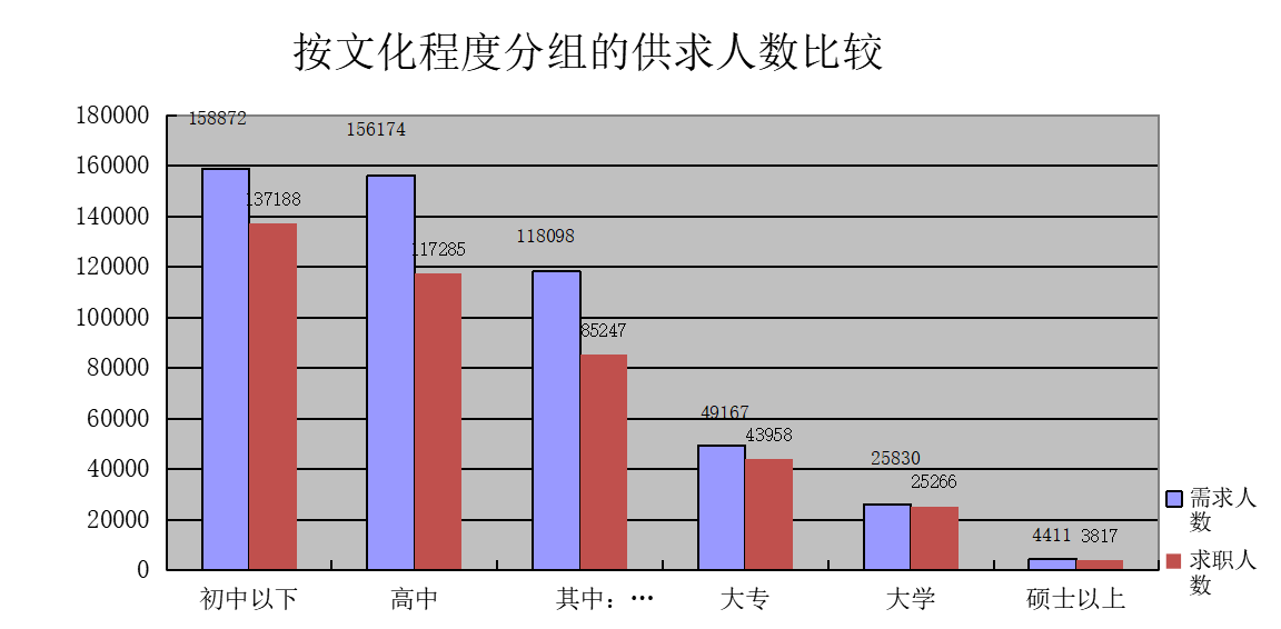从文化程度上看,高中和初中以下学历的求职人员占求职总数的77.70%,整个人力资源供给市场学历仍相对较低,人力资源供给的素质结构需要进一步提升。
