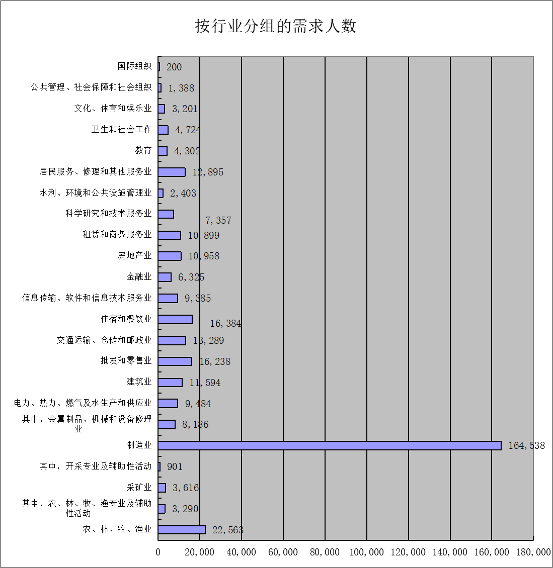 从行业需求来看:“制造业”、“农、林、牧、渔业”、“住宿和餐饮业”占据着各行业中用工量的前三位。占比依次为49.60%、6.80%、4.94%。