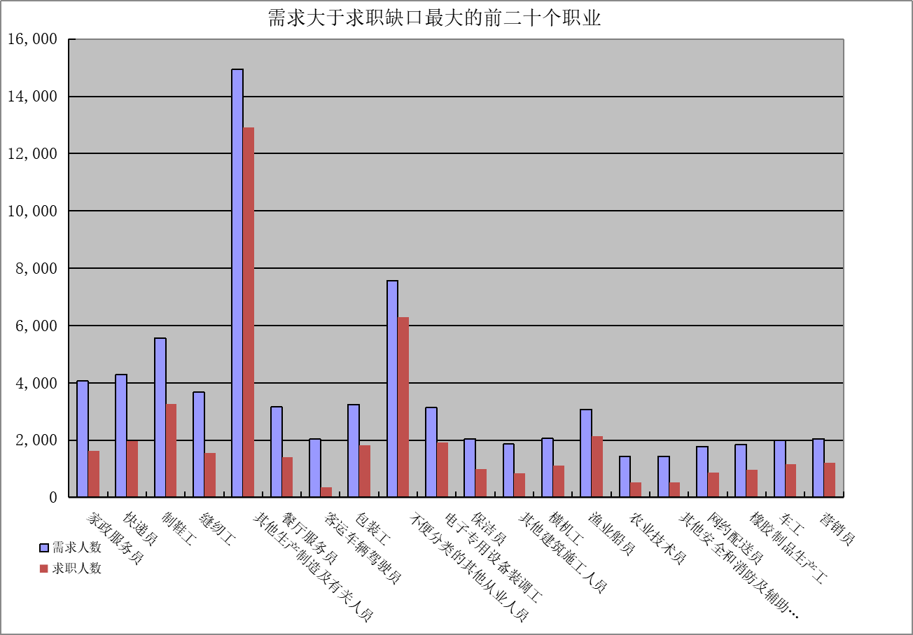 一是求大于供岗位(工种):“家政服务员”、“快递员”、“制鞋工”企业需求缺口分别是2443人次、2322人次、2300人次。二是供大于求岗位(工种):“行政办事员”、“秘书”、“其他办事人员和有关人员”的市场登记缺口分别是-2542人次、-1685人次、-1616人次。