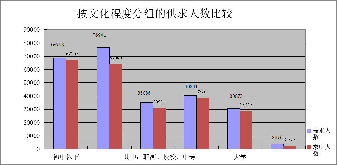 从文化程度上看,高中和初中以下学历的求职人员占求职总数的65.17%,整个人力资源供给市场学历仍相对较低,人力资源供给的素质结构需要进一步提升。