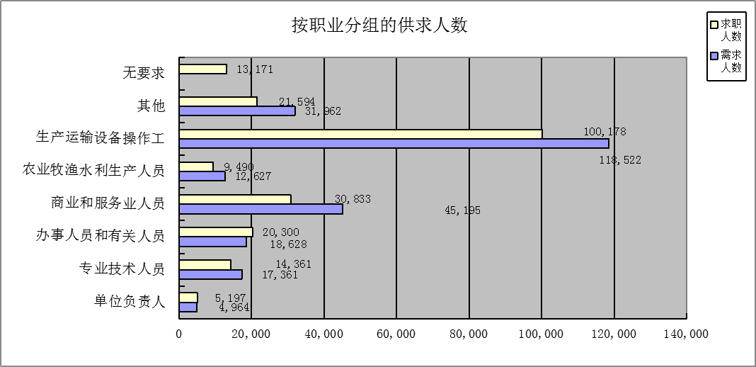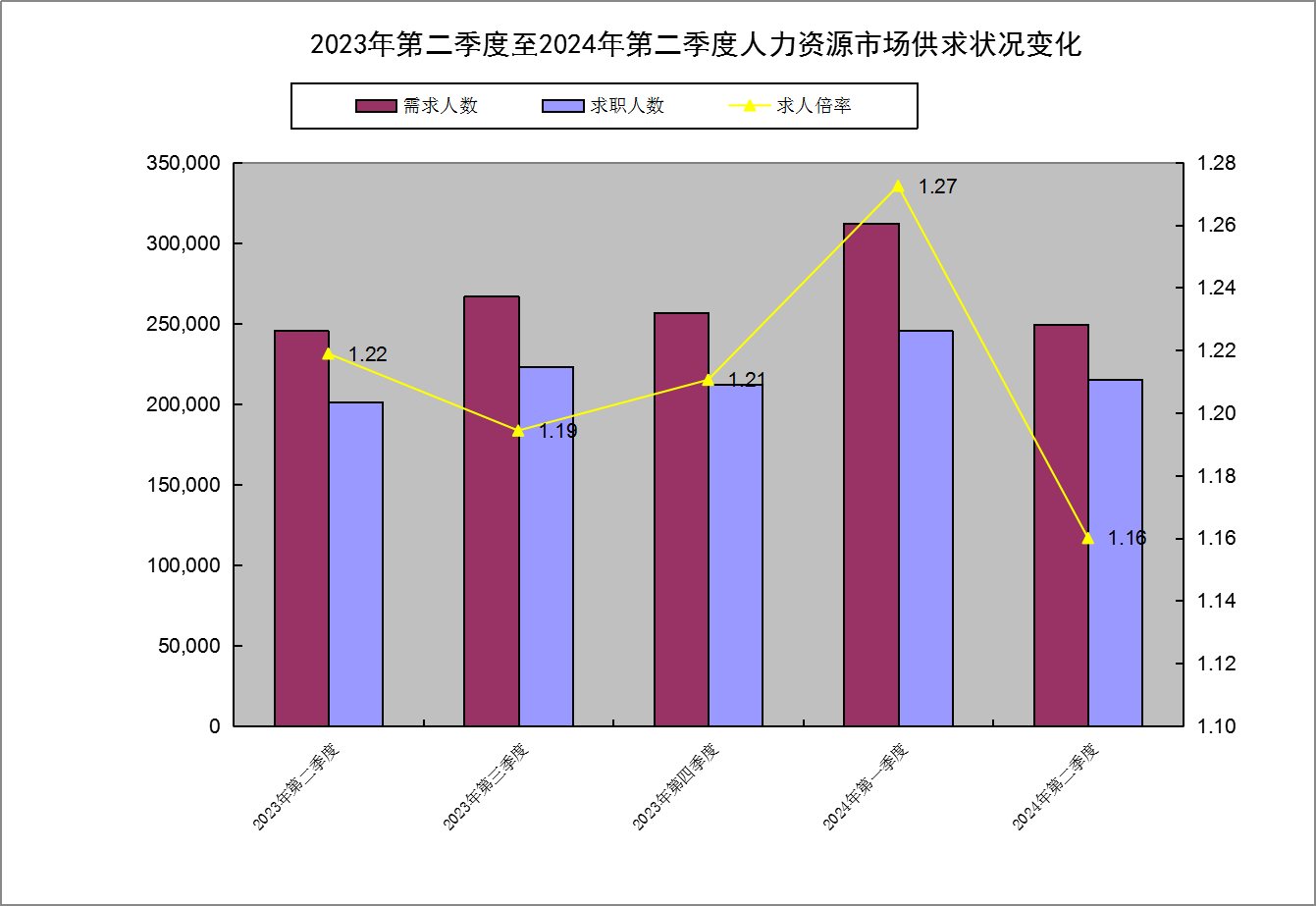 本季度职业供求总量为46.44万人次,同比上升3.93%,环比下降16.73%。其中:岗位需求登记24.93万人次,同比上升1.55%,环比下降20.18%;求职登记21.51万人次,同比上升6.82%,环比下降12.34%。
