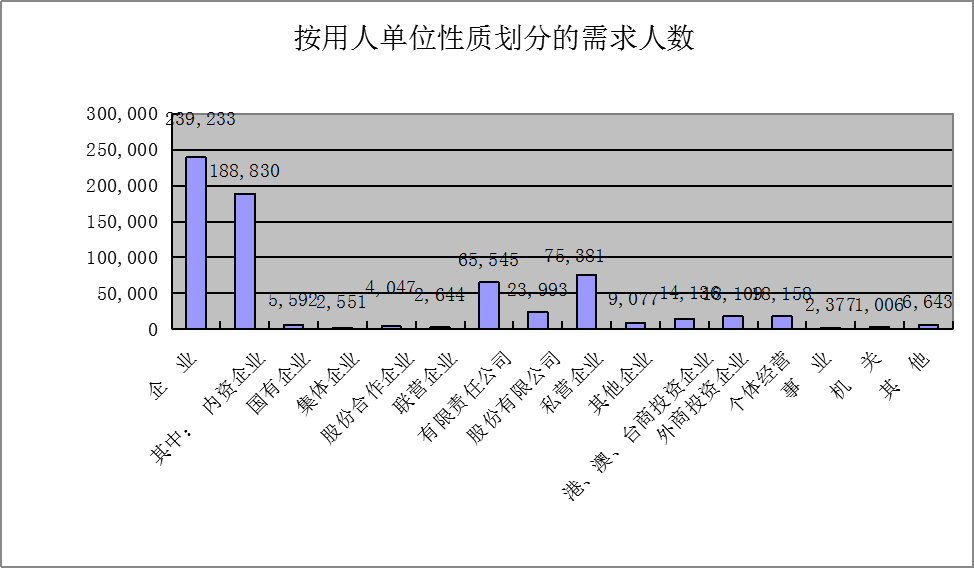 从用人单位性质来看:内资企业需求总量为18.88万人次,所占比重达到企业需求总量的78.93%;内资企业中的“私营公司”、“有限责任公司”、“股份有限公司”为用工需求量前三位的用人单位,用工需求量分别占企业需求总量的31.51%、27.4%、10.03%。