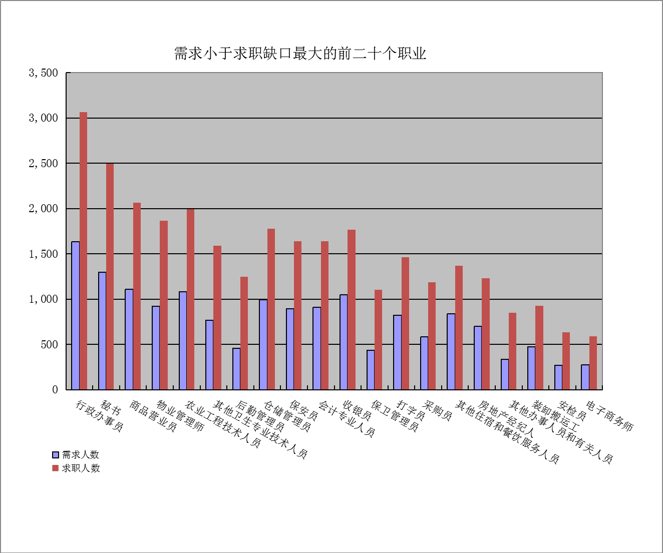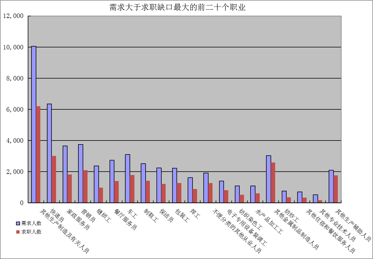 一是求大于供岗位(工种):“其他生产制造及有关人员”、“快递员”、“家政服务员”企业需求缺口分别是3848人次、3333人次、1834人次。二是供大于求岗位(工种):“行政办事员”、“秘书”、“商品营业员”的市场登记缺口分别是-1434人次、-1198人次、-957人次。