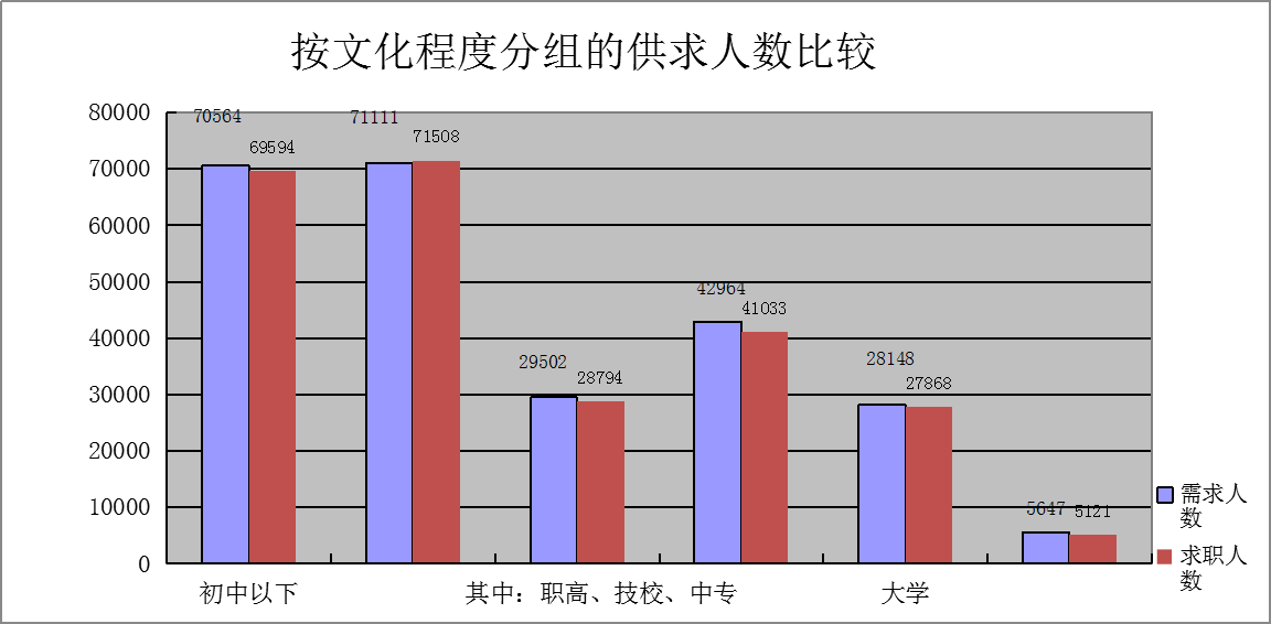 从文化程度上看,高中和初中以下学历的求职人员占求职总数的65.59%,整个人力资源供给市场学历仍相对较低,人力资源供给的素质结构需要进一步提升。