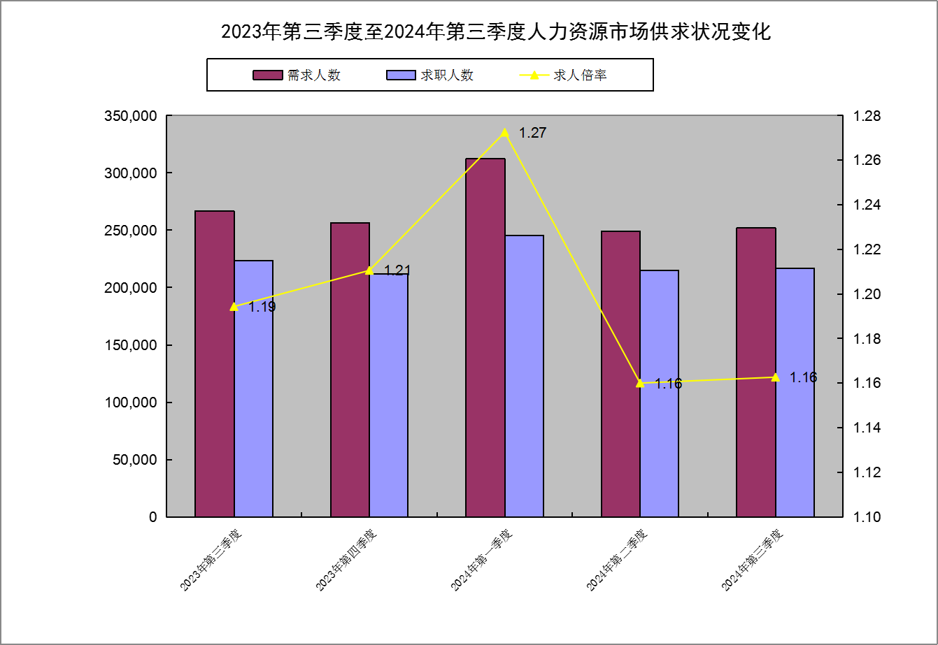 第三季度,全省企业用工需求和求职人数较上季度略微增加,但较上年同期,岗位需求人数、求职人数同比均有所下降。求人倍率同比下降、环比不变,人力资源市场供求不旺盛。