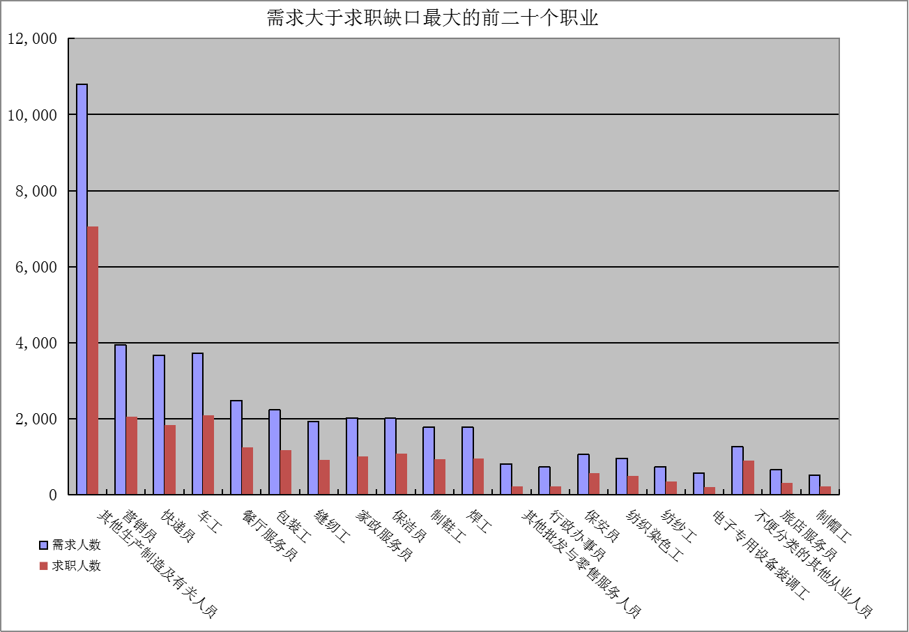 一是求大于供岗位(工种):“其他生产制造及有关人员”、“营销员”、“快递员”企业需求缺口分别是3739人次、1881人次、1839人次。二是供大于求岗位(工种):“行政办事员”、“秘书”、“商品营业员”的市场登记缺口分别是-1253人次、-1013人次、-818人次。