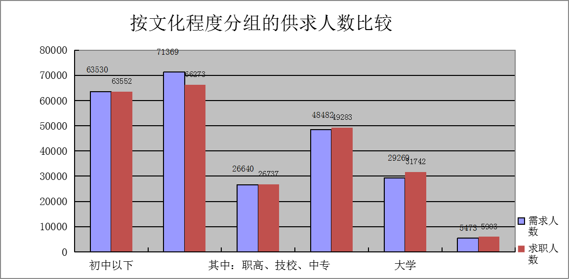 从文化程度上看,高中和初中以下学历的求职人员占求职总数的62.81%,整个人力资源供给市场学历仍相对较低,人力资源供给的素质结构需要进一步提升。