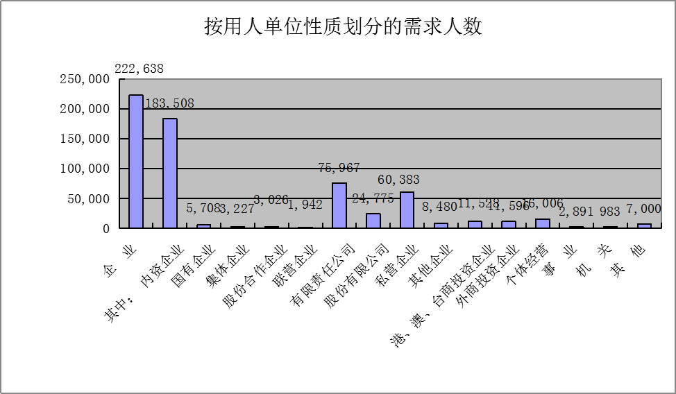 从用人单位性质来看:内资企业需求总量为18.35万人次,所占比重达到企业需求总量的82.42%;内资企业中的“有限责任公司”、“私营公司”、“股份有限公司”为用工需求量前三位的用人单位,用工需求量分别占企业需求总量的34.12%、27.12%、11.13%。
