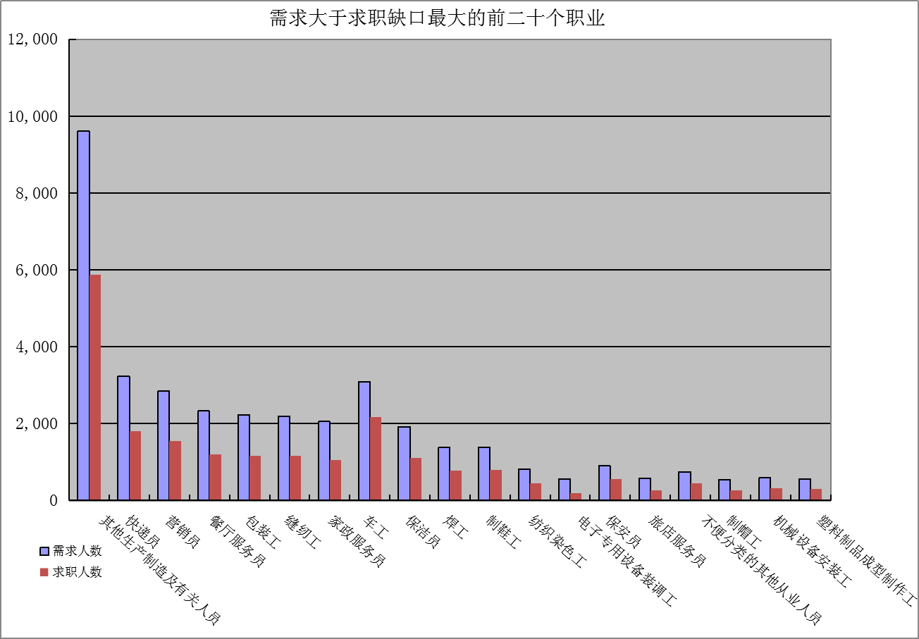 一是求大于供岗位(工种):“其他生产制造及有关人员”、“快递员”、“营销员”企业需求缺口分别是3742人次、1435人次、1286人次。二是供大于求岗位(工种):“行政办事员”、“商品营业员”、“会计专业人员”的市场登记缺口分别是-1197人次、-751人次、-676人次。