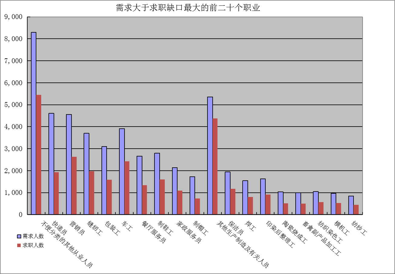 一是求大于供岗位(工种):“不便分类的其他从业人员”、“快递员”、“营销员”企业需求缺口分别是2836人次、2673人次、1925人次。二是供大于求岗位(工种):“行政办事员”、“其他住宿和餐饮服务人员”、“会计专业人员”的市场登记缺口分别是-1303人次、-962人次、-846人次。