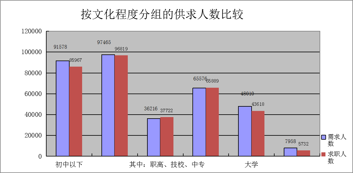 从文化程度上看,高中和初中以下学历的求职人员占求职总数的61.34%,整个人力资源供给市场学历仍相对较低,人力资源供给的素质结构需要进一步提升。